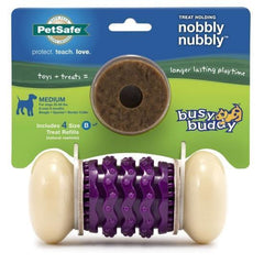 The durable Nobbly Nubbly gives your dog multiple treat options for longer lasting playtime. Your dog can chew on the heavy-duty nylon nobs or the softer, compressible rubber center. Attach Busy Buddy treat rings to the toy or fill the grooves with your dog’s favorite spreadable treat, such as peanut butter or cheese. The toy is made of durable nylon...