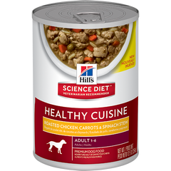 Hills Science Diet Adult Healthy Cuisine Roasted Chicken, Carrots & Spinach Stew is specifically designed for adult dogs between ages of 1 & 6. It consists of tasty roasted chicken and gently cooked vegetables in a delicious stew. It has the ideal balance of nutrition and taste and nutrition for your dog without any of the artificial flavours or preservatives....