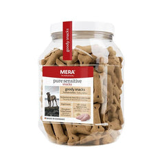 MERA PURE Goody Snacks. Extremely tasty, gluten-free dog biscuits. For demanding dogs that are susceptible to allergies. These dog biscuits are an ideal reward for your dog. They are delicious and easily digestible and round off the daily daily PURE food range perfectly. Description Extremely tasty, gluten-free dog biscuits. For demanding dogs that are susceptible to allergies. These dog biscuits...