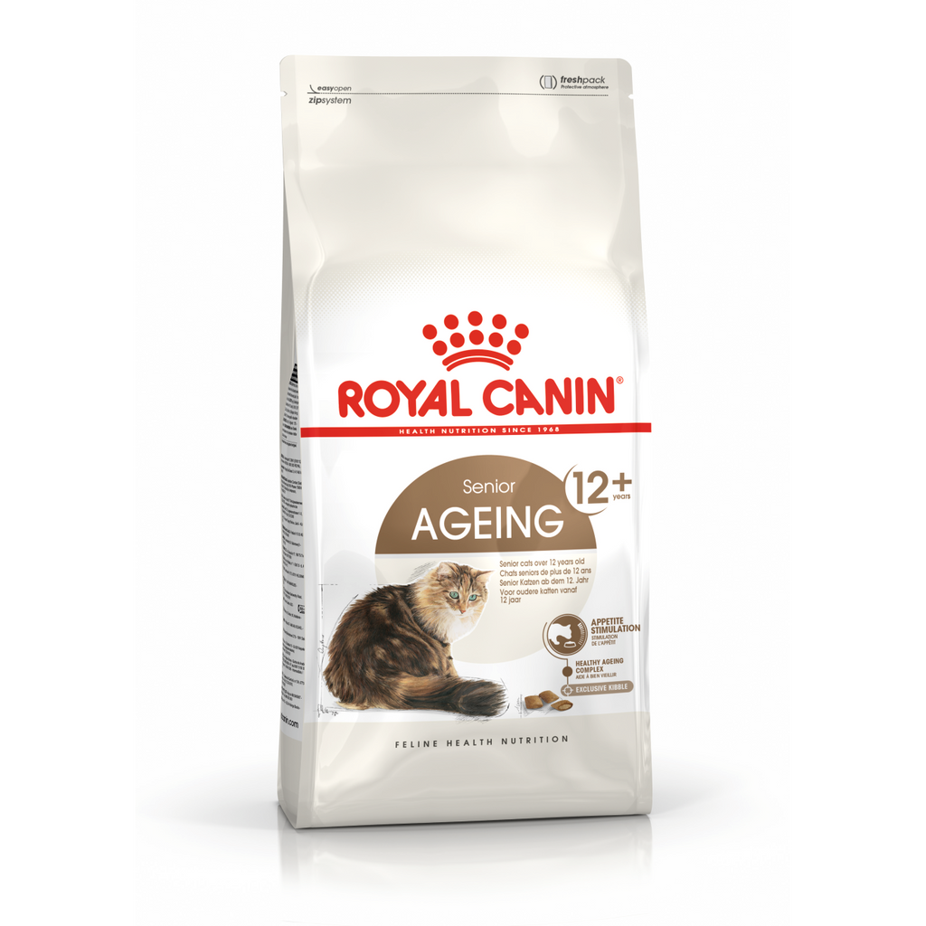Ageing cats have different nutritional needs than their younger counterparts; that's why it's important to modify your cat's diet as it ages, to ensure that those needs are being met and maintained.ROYAL CANIN® Senior Ageing 12+ is suitable for cats over 12 years of age and is specially formulated with the nutritional needs of senior cats like yours in mind. This food contains highly palatable kibble with a double texture (crunchy outside, soft inside) that helps to stimulate your senior cat's general appetite.ROYAL CANIN® Senior Ageing 12+ contains a patented complex of antioxidants that support senior cats throughout the ageing process. Thanks to a moderate phosphorus level, ROYAL CANIN® Senior Ageing 12+ also helps to support healthy kidney function, which is highly beneficial in senior cats.To cater to each cat's individual preferences, ROYAL CANIN® Senior Ageing 12+ is also available as wet food in either a delicious gravy or succulent jelly. If you're considering mixed feeding, simply follow our feeding guidelines to ensure your cat gets an accurate amount of both wet and dry food for optimal benefit.