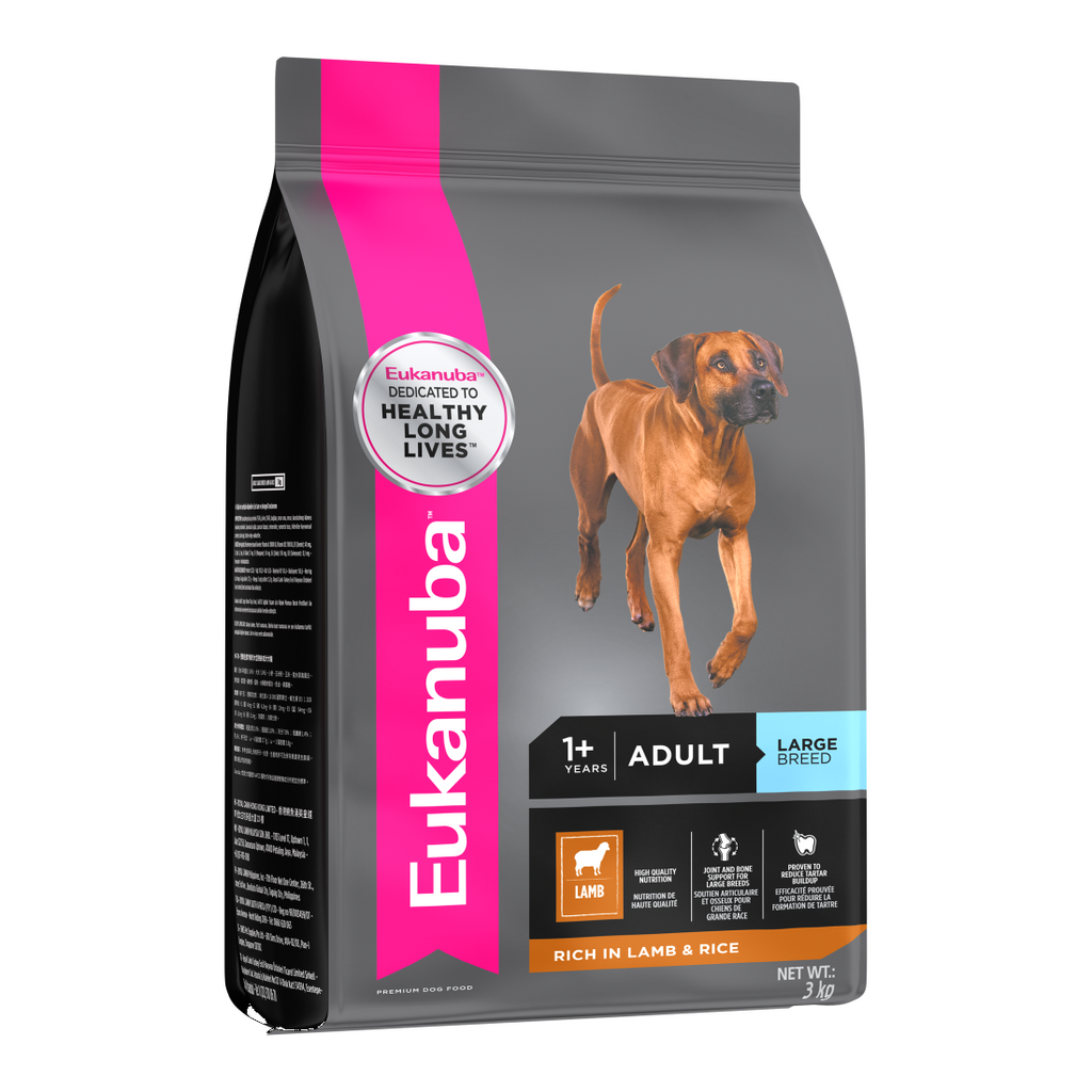 Eukanuba's Dog Food for Adult Large Breeds with a sensitive skin and stomach, recommended for large breed dogs. Formulated with prebiotics and beet pulp, Eukanuba Adult Dry Dog Food for Large Breeds rich in Lamb & Rice promotes digestive health and supports healthy joints. This canine food has high quality, animal-based proteins, to help maintain strong and lean muscles, and calcium to help support strong bones. With antioxidants to help build your dog’s natural defences and optimal levels of Omega-6 and 3 fatty acids promote a healthy skin and radiant coat.