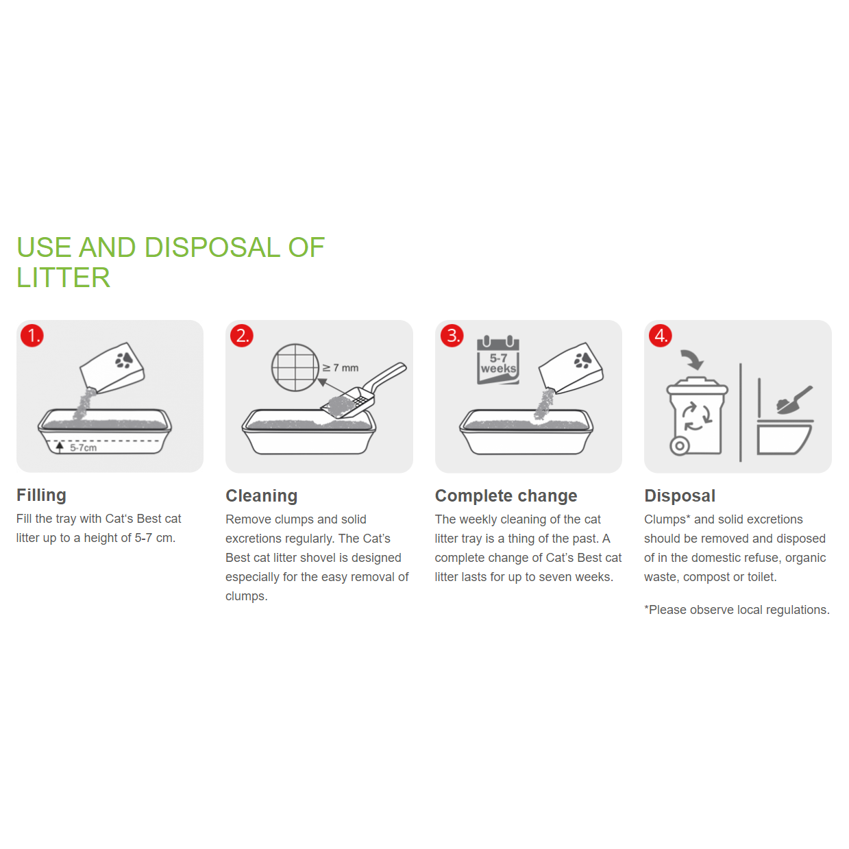 This neutralises odours so effectively, that the cat litter can remain in the litter tray for up to seven weeks. Cat’s Best Original functions best when you regularly dispose of the solid excretions and clumps that form after the cat has used the litter tray. This saves time and costs and ensures the type of hygiene and comfort that cats prefer.